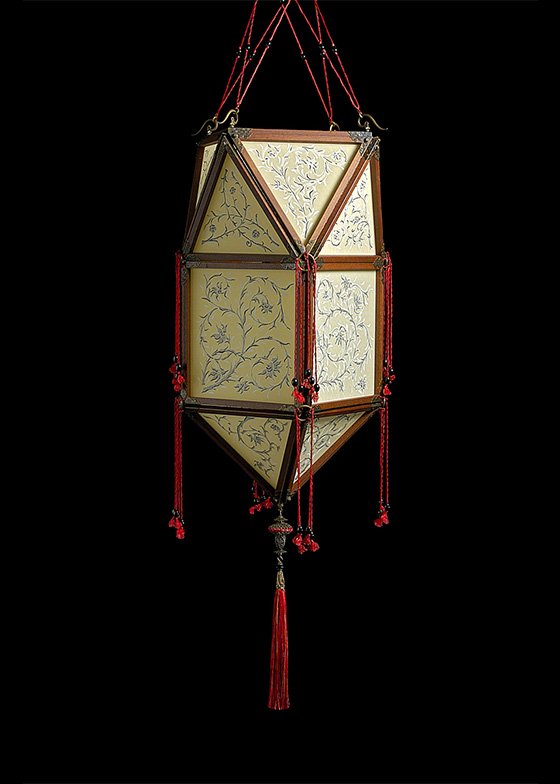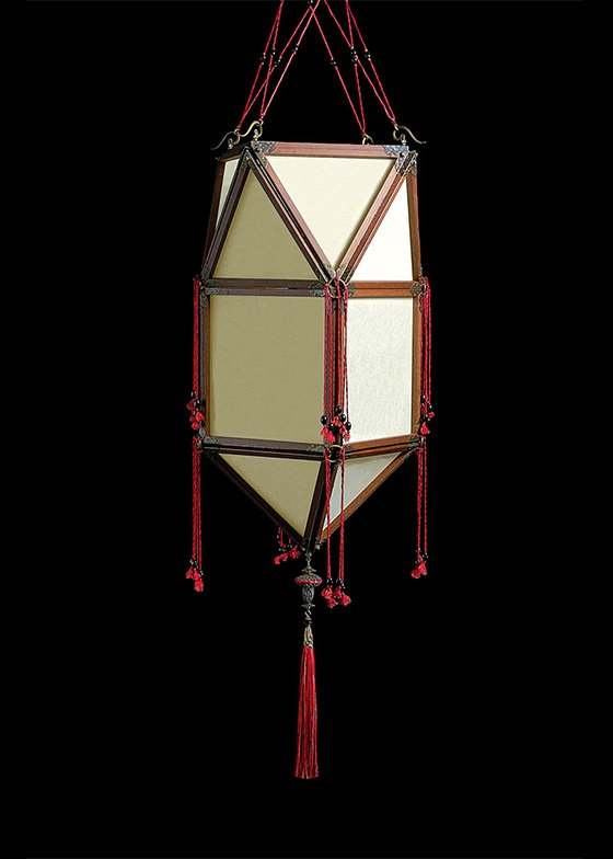 The Fortuny Concubine Peonia plain silk lamp (peony concubine) is a subtler variation of the Imperial lamp. It evokes the allure of Oriental culture and has the same triangle and square pattern bound by fiery red thread – but the shape is more reserved than it’s Imperial counterpart. The simple wood structure protects the silk and enhances its silvery patterns.
