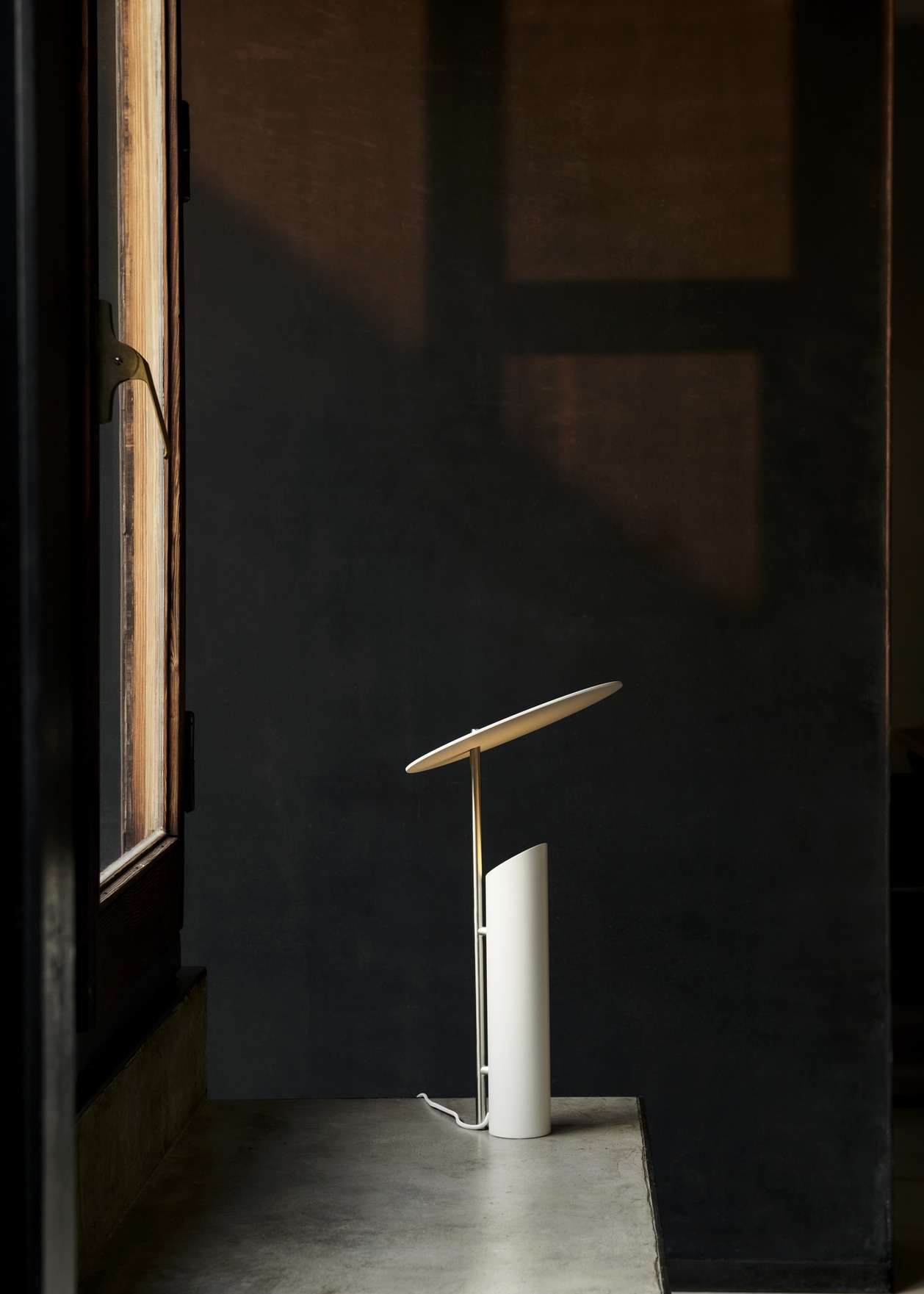 Reflect offers a simpler and more linear style than we have come to expect from Panton. It represents a great example of his ingenuity and profound understanding of how to manipulate light to create a desired setting or mood. With Reflect, light is cast upwards from the tubular base and reflected off the white surface of the slanted disc-shaped shade to create a crisp yet diffused light throughout its surroundings.