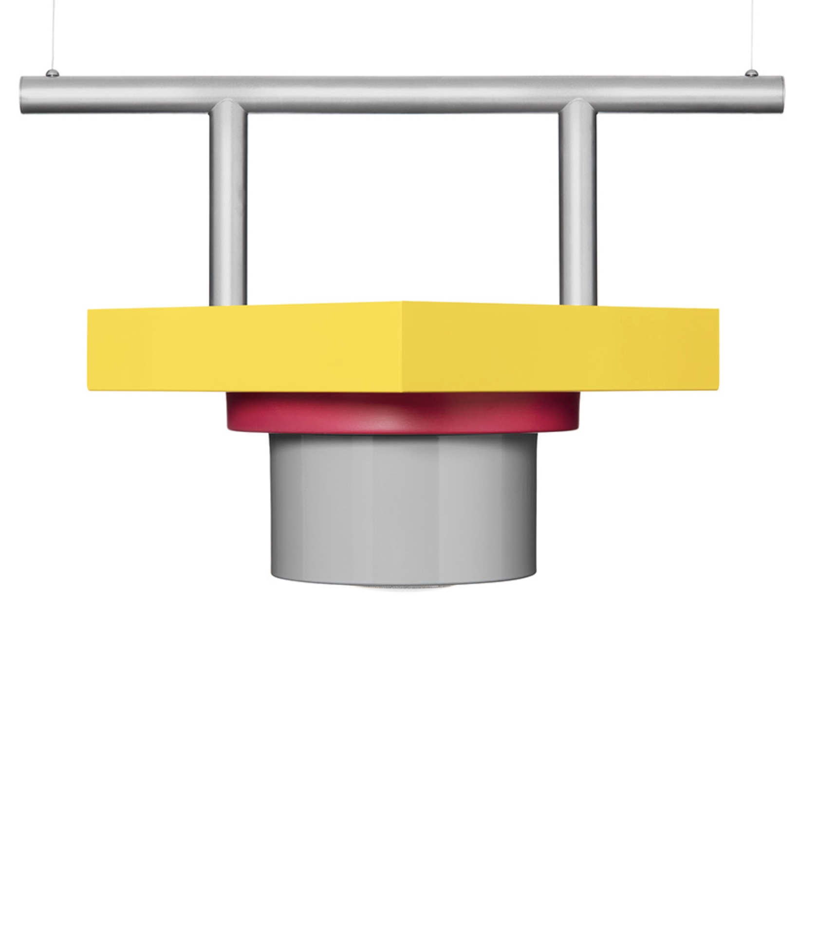 Rossella recalls a suspended fragment of classical entablature, playing with our imagination in a continuous reference to references. A painted metal pendant lamp designed by Marco Zanini in 1985, Rossella, eccentric, colorful, and with a strong expressive identity, expresses the desire to break away from the monotony of everyday life.