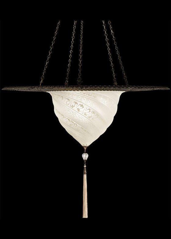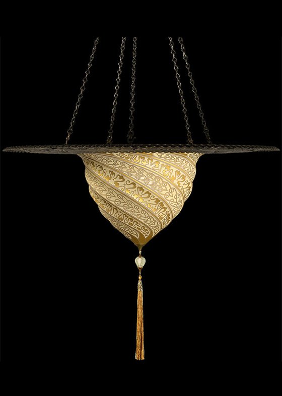 Samarkand is a city in present day Uzbekistan, and lies on the famous Silk Road trade route linking Venice and China. This lamp’s unique shape and quintessential Fortuny pattern evoke the mystique of those ancient trade journeys, and the cultural fusion they sparked. The light filters through the glass and penetrates the inlay of the decorative metal ring.