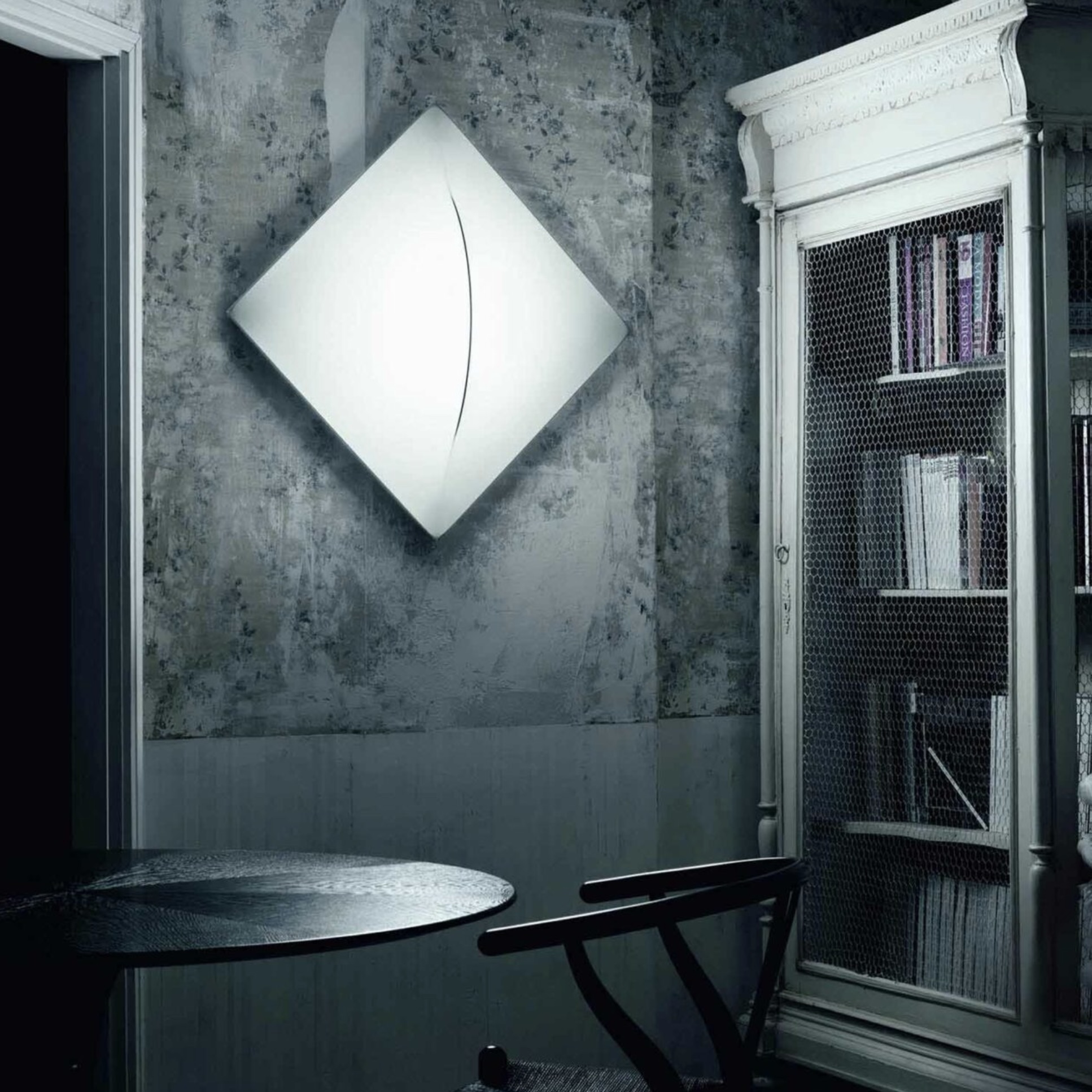 Designed by Kazuhide Takahama in 1973, Saori is a wall and ceiling lamp that represents one of the earliest examples of lighting as an architectural element. A white painted metal structure supports a fabric diffuser.