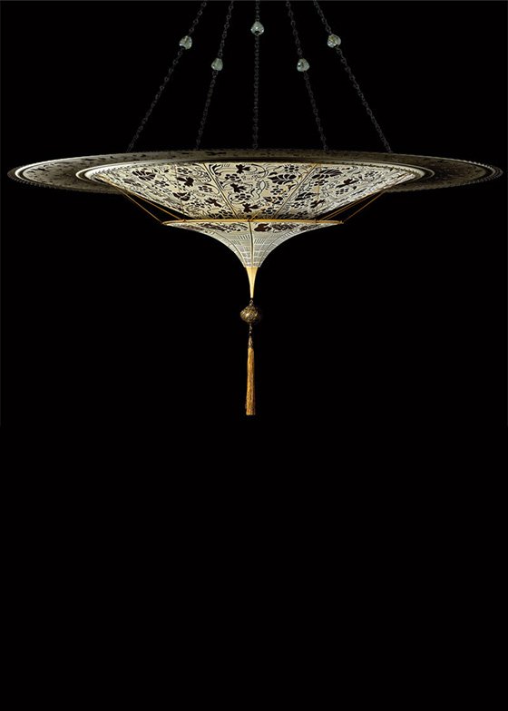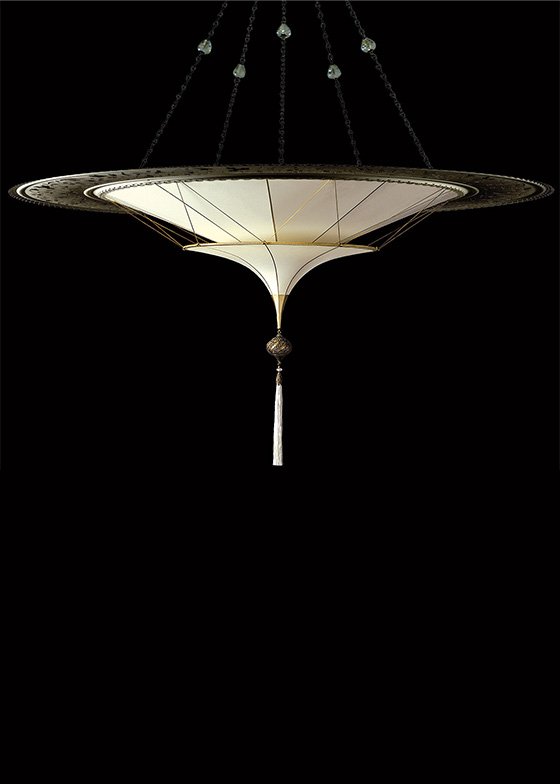 The name of this Scheherazade silk lamp with metal ring reflects the atmosphere it creates: a mixture of excitement and magnificence, along with intelligence and romance. It combines Mariano Fortuny’s love for combining the Venetian and the Oriental. The elegant 2-tier structure has the form of an upside-down pagoda and is suspended by a delicate net of cords decorated with Murano glass beads. The lower tier culminates with a fine engraved drop.