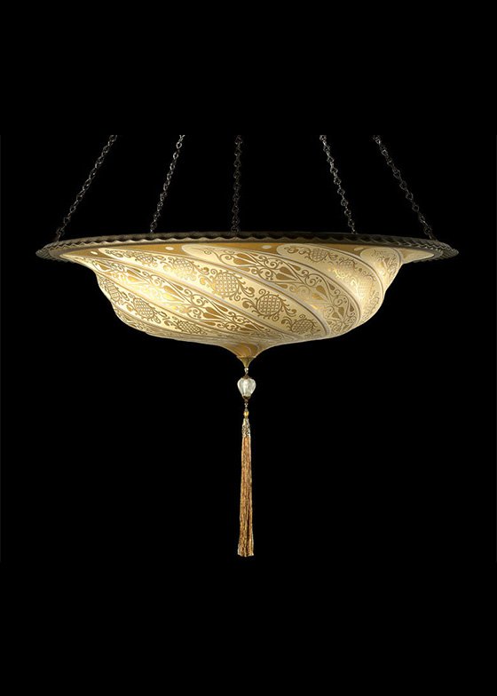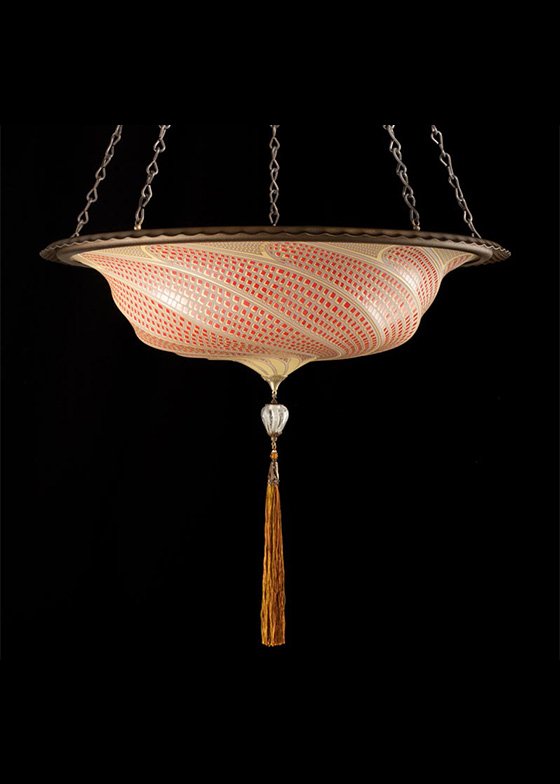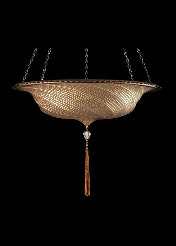 Scudo Saraceno translates to Saracen Shield – Saracen was a term used in medieval Europe to describe Muslims. This exotic design reflects Mariano Fortuny’s interest in Saracen artistic themes. This Fortuny Scudo Saraceno ceiling glass lamp is ideal for large, sophisticated interiors. Choose from 3 sizes and customise this lamp to suit your aesthetic, with choice of colour, pattern and ceiling attachment.
