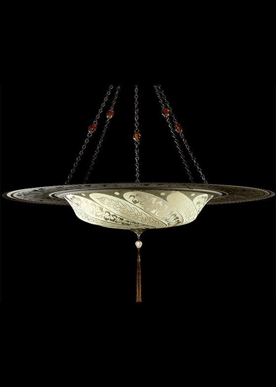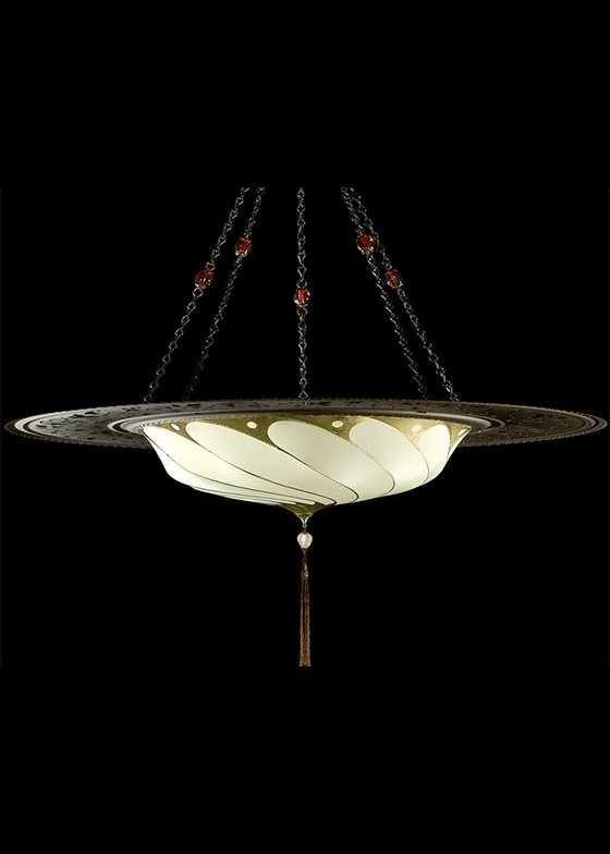 Scudo Saraceno translates to Saracen Shield – Saracen was a term used in medieval Europe to describe Muslims. This exotic design reflects Mariano Fortuny’s interest in Saracen artistic themes. Fortuny Scudo Saraceno silk lamp with metal ring is ideal for large, sophisticated interiors. The light filters through the silk and penetrates the inlay of the decorative ring to create an evocative atmosphere.