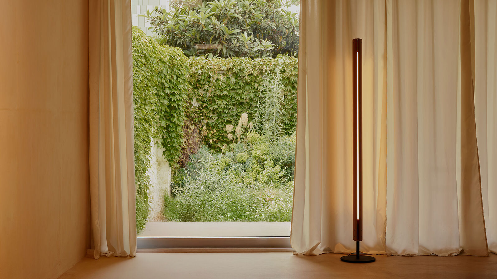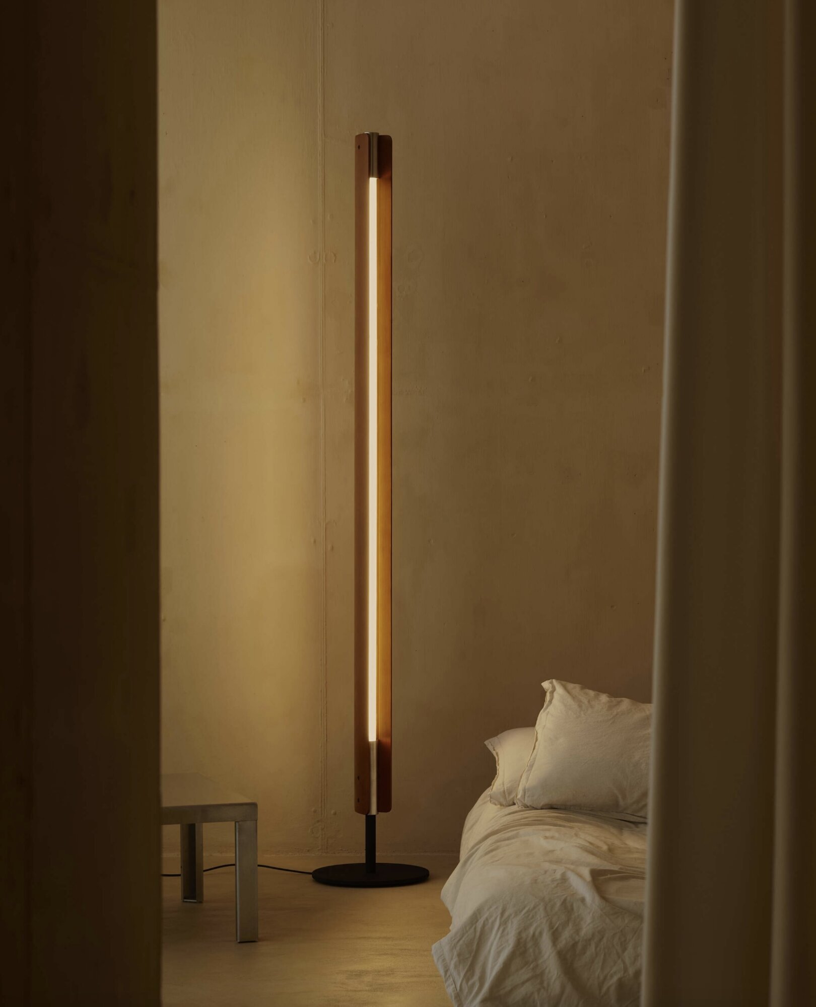 Floor lamp emitting direct and indirect light with symmetrical and asymmetrical distribution. Features two vertical ash wood blades joined by chromed metal fittings. Blades rotate around a central tubular light source to allow variable light emission. Raw black iron base separated from the vertical blades by a collar. Custom-developed dimmable linear LED light source. The lamp can also be fitted with standard T8 LED tubes.Designed by Tobia Scarpa in 1963 and reissued in 2025, Seki-Han is testament to his mastery of design and wood-working expertise. The intricate construction draws on naval techniques to shape two wooden blades that now rotate around the light source. Even when almost completely closed, a sliver of light remains visible, creating a highly poetic effect. Named after a traditional Japanese rice dish served on special occasions, Seki-Han is a living presence where the immateriality of light meets the tactility of wood.