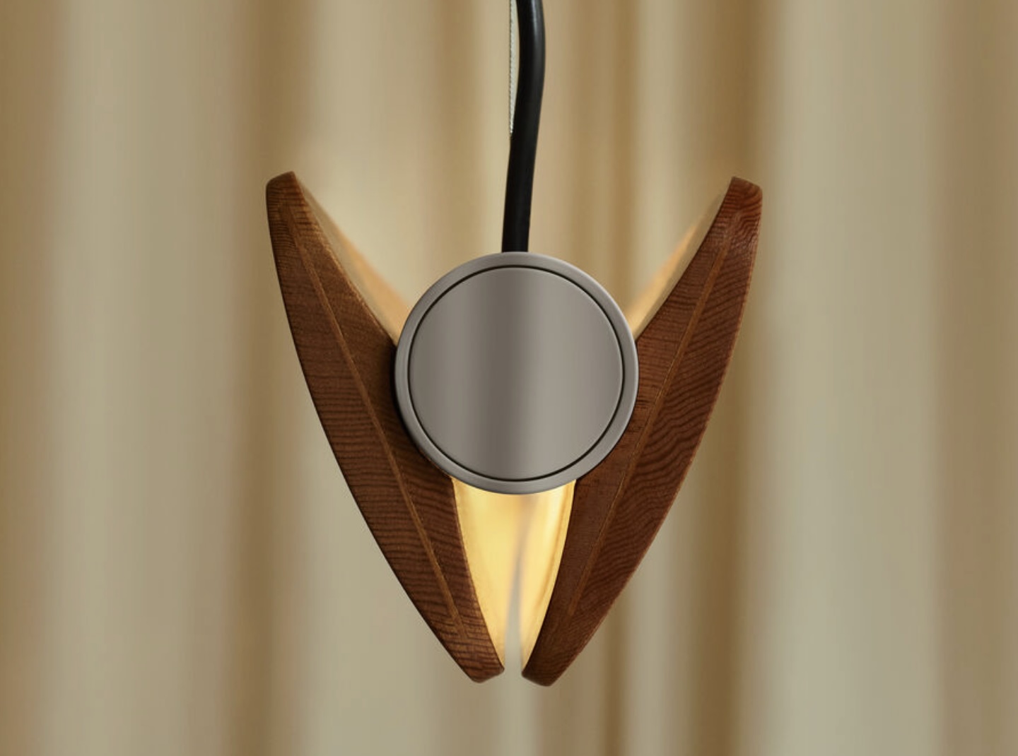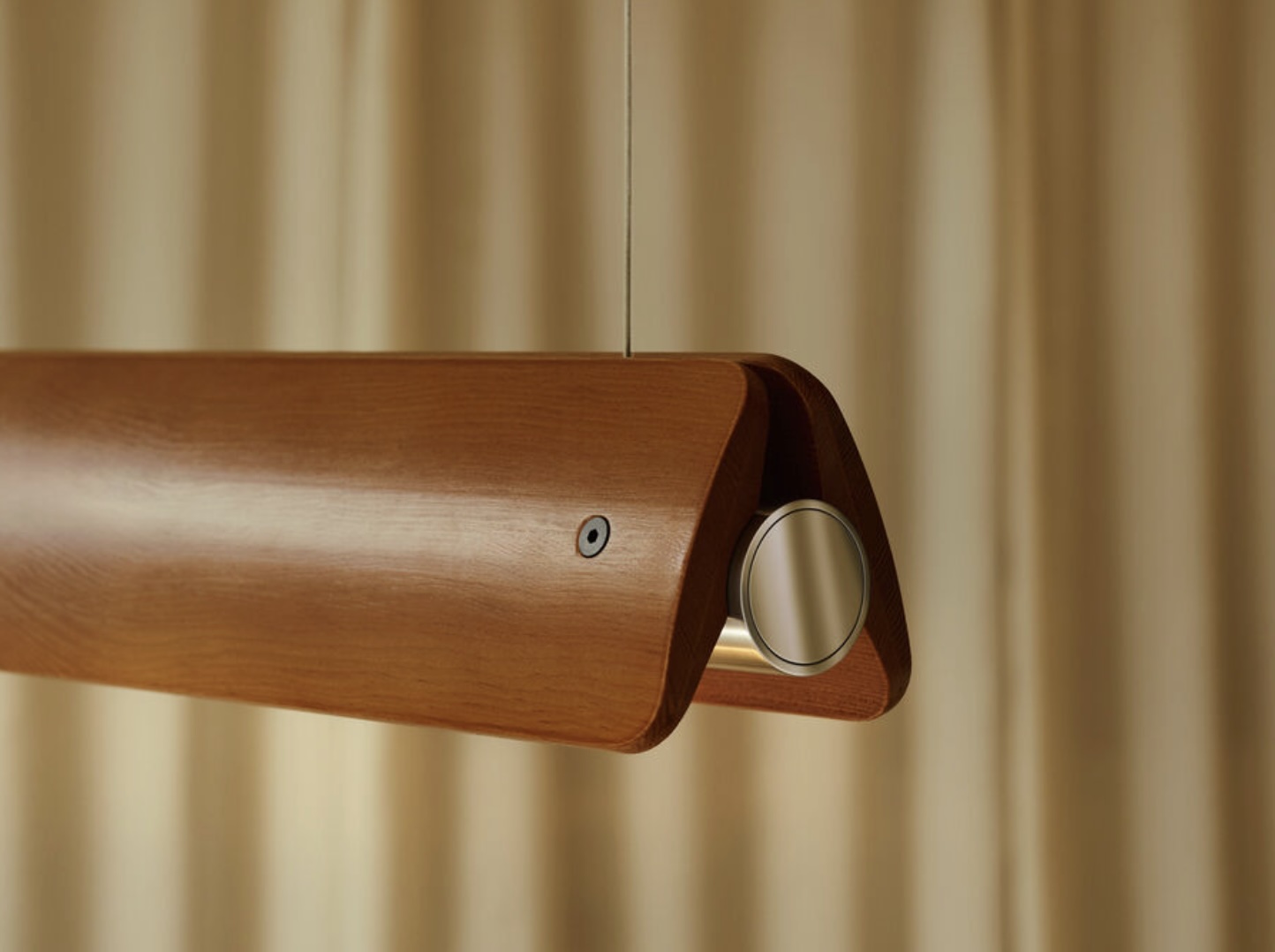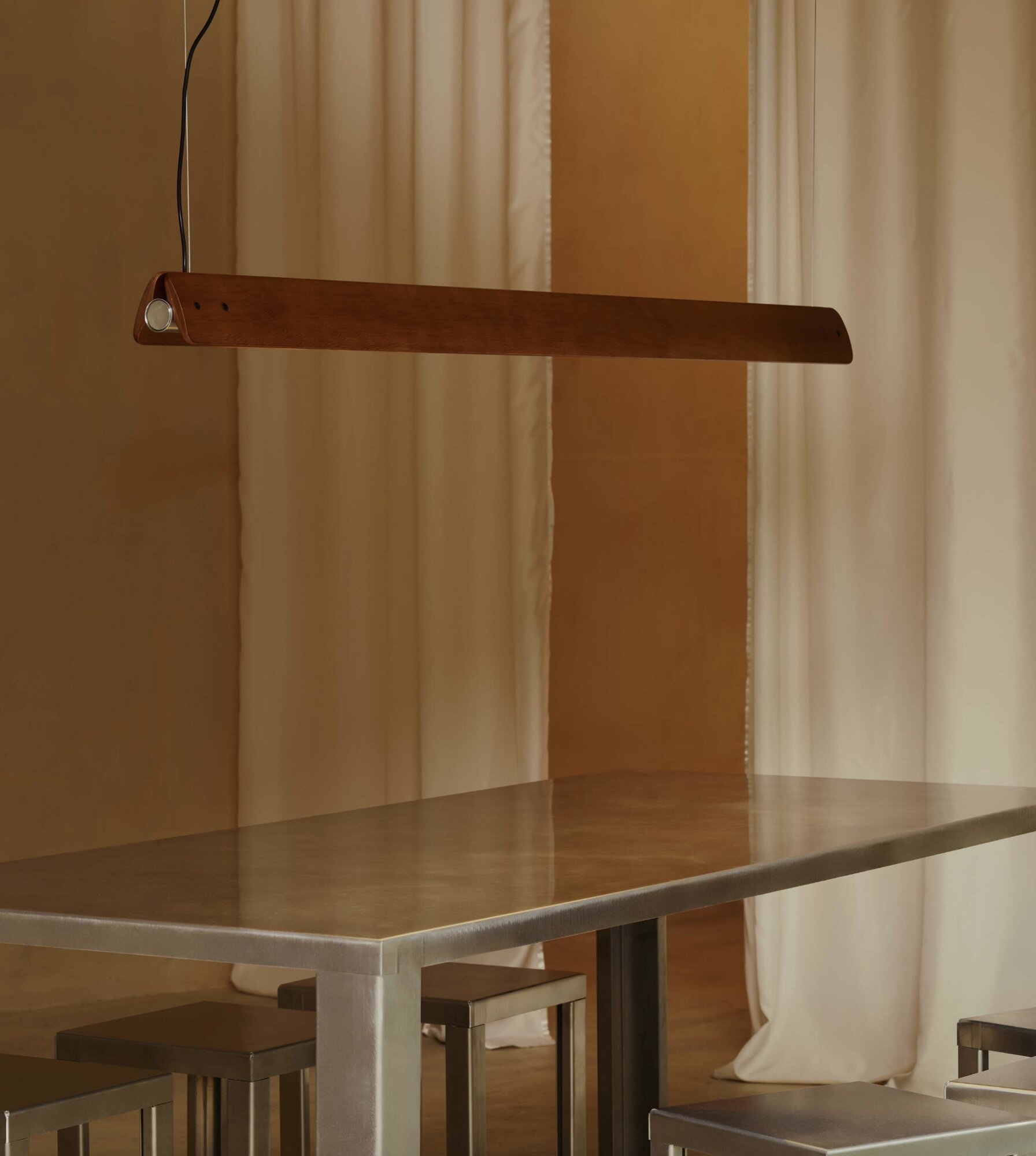 Suspension lamp emitting direct and indirect light with symmetrical and asymmetrical distribution. Features two horizontal ash wood blades joined by chromed metal fittings. Blades rotate around a central tubular light source to allow variable light emission. Custom-developed dimmable linear LED light source. The lamp can also be fitted with standard T8 LED tubes.Designed by Tobia Scarpa in 1963 and reissued in 2025, Seki-Han is testament to his mastery of design and wood-working expertise. The intricate construction draws on naval techniques to shape two wooden blades that now rotate around the light source, leaving a slender sliver of light visible at all times for a highly poetic effect. The re-edition also introduces an elegant suspension model, identical in design but with a slightly shorter body. In both versions, Seki-Han is a living presence where the immateriality of light meets the tactility of wood.