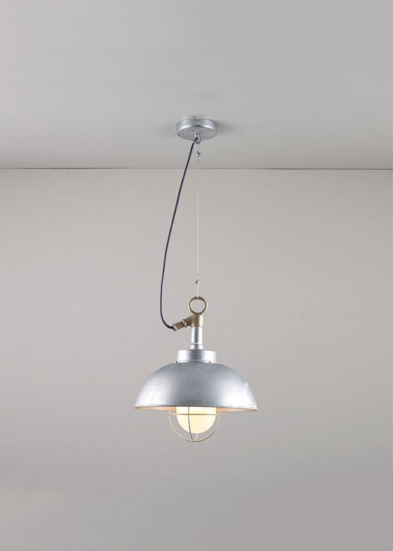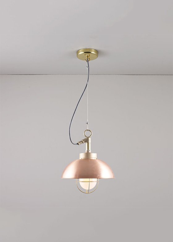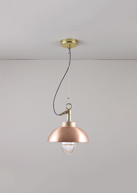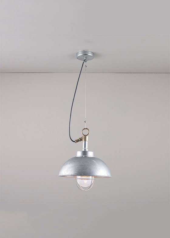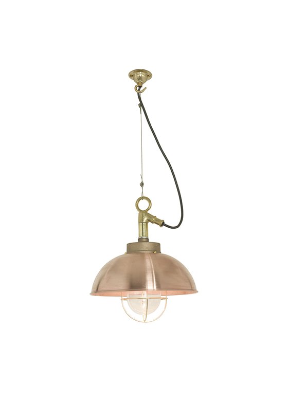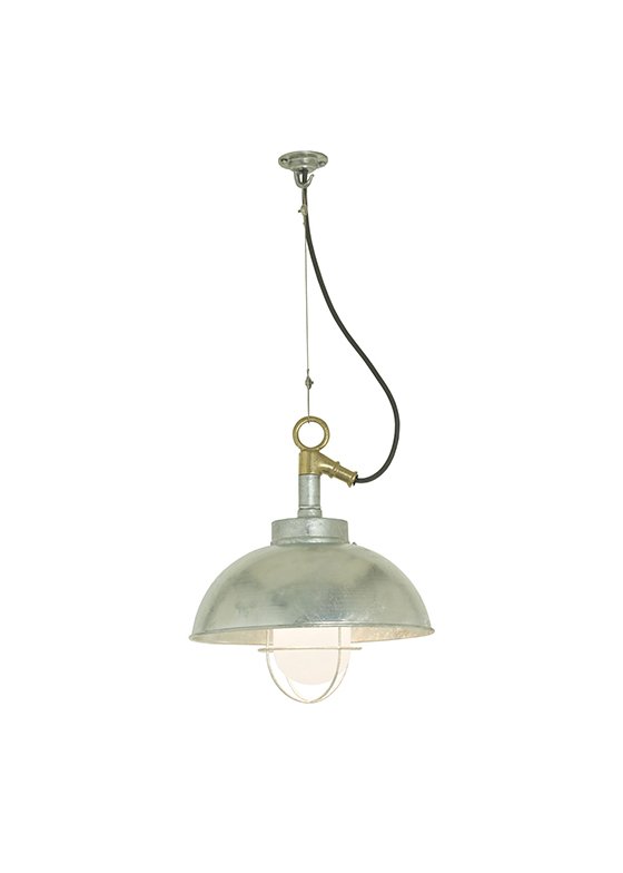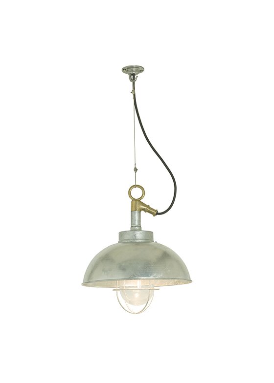 The Shipyard Pendant is a highly engineered cast brass fixture with a strong copper or galvanized reflector. It features a heavy gunmetal crown and sturdy wire guard with clear or frosted well glass fitted. IP44 rated, this pendant is an ideal lighting solution for exterior spaces.
