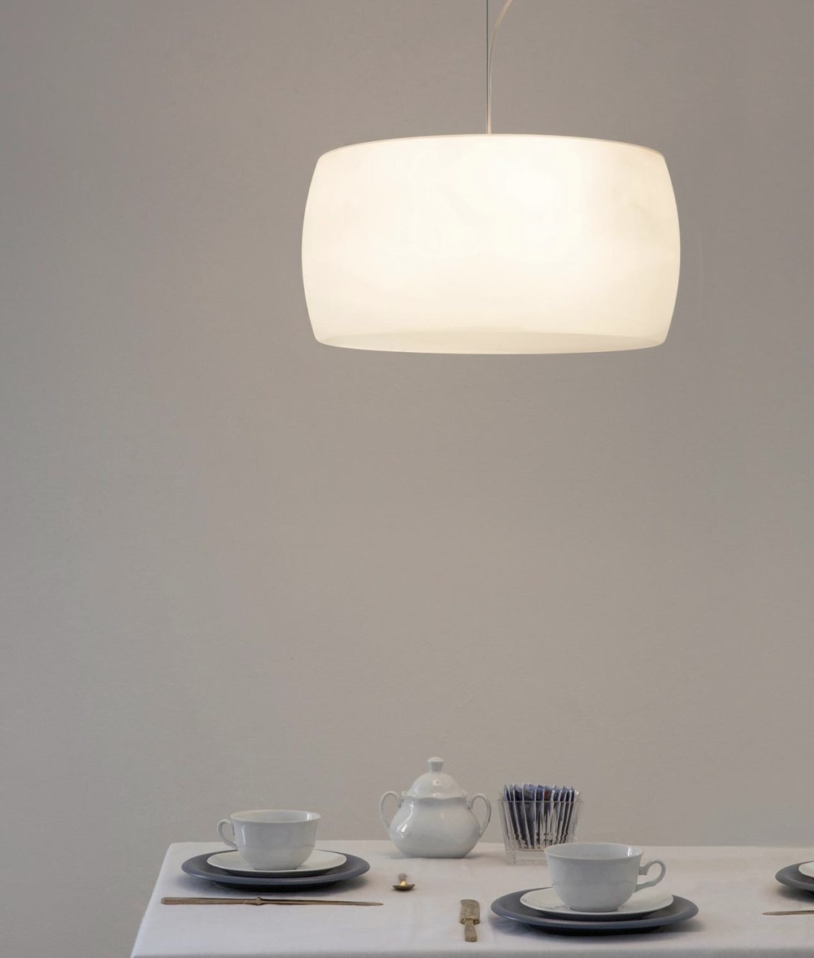 A circular diffuser in opal white triplex blown glass encloses a central structure in shiny polished die-casted aluminum from which the light diffuses uniformly.