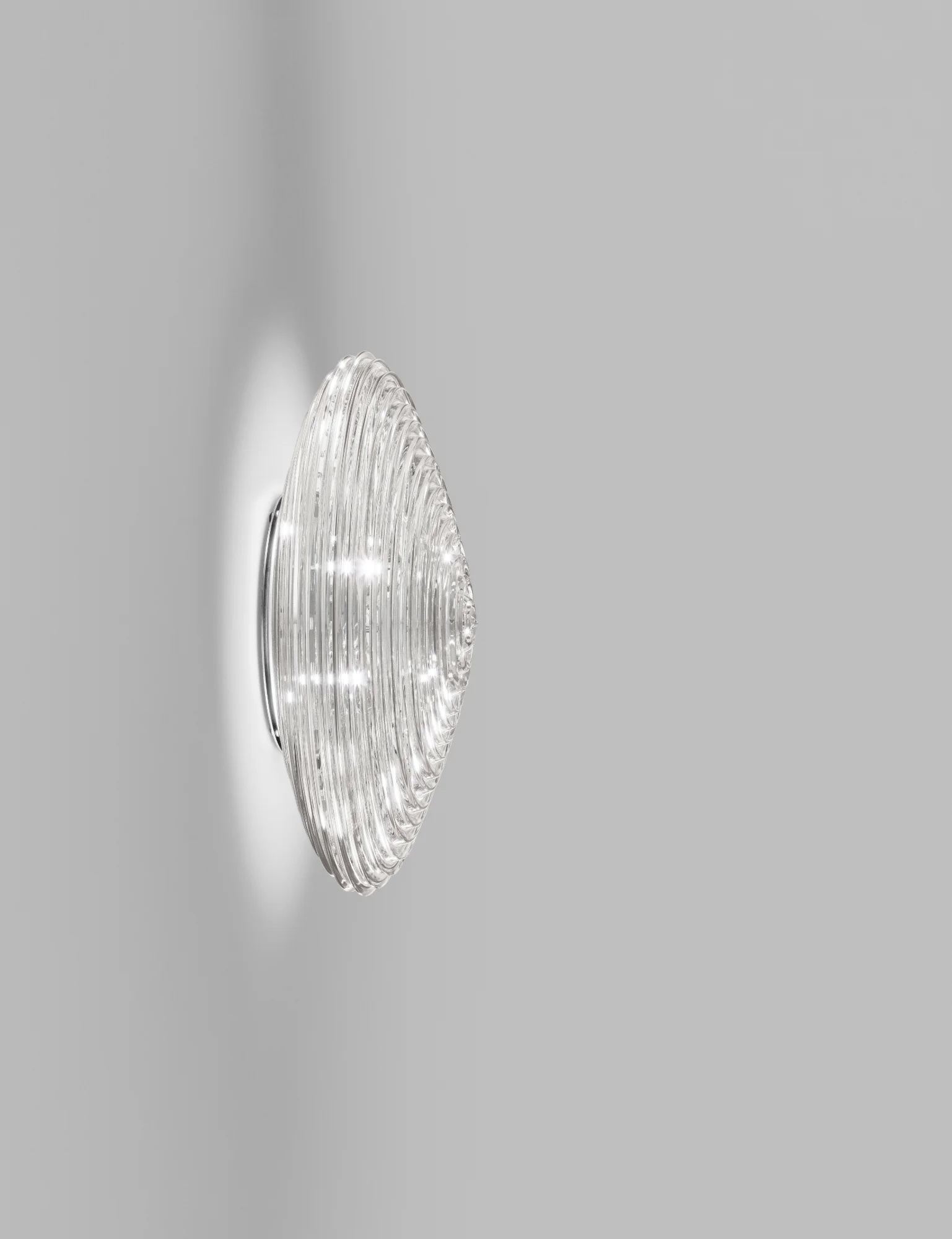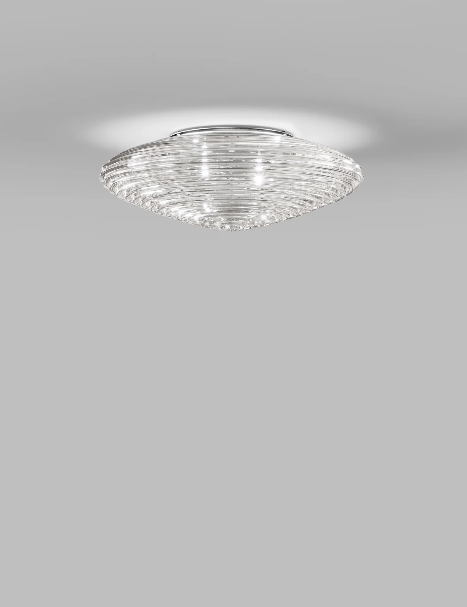 Spirit has the shape of a diamond blown into glass. Its folds are the result of a long process of development that creates a unique light reflection, while keeping the source of light hidden even in the transparent crystal version.