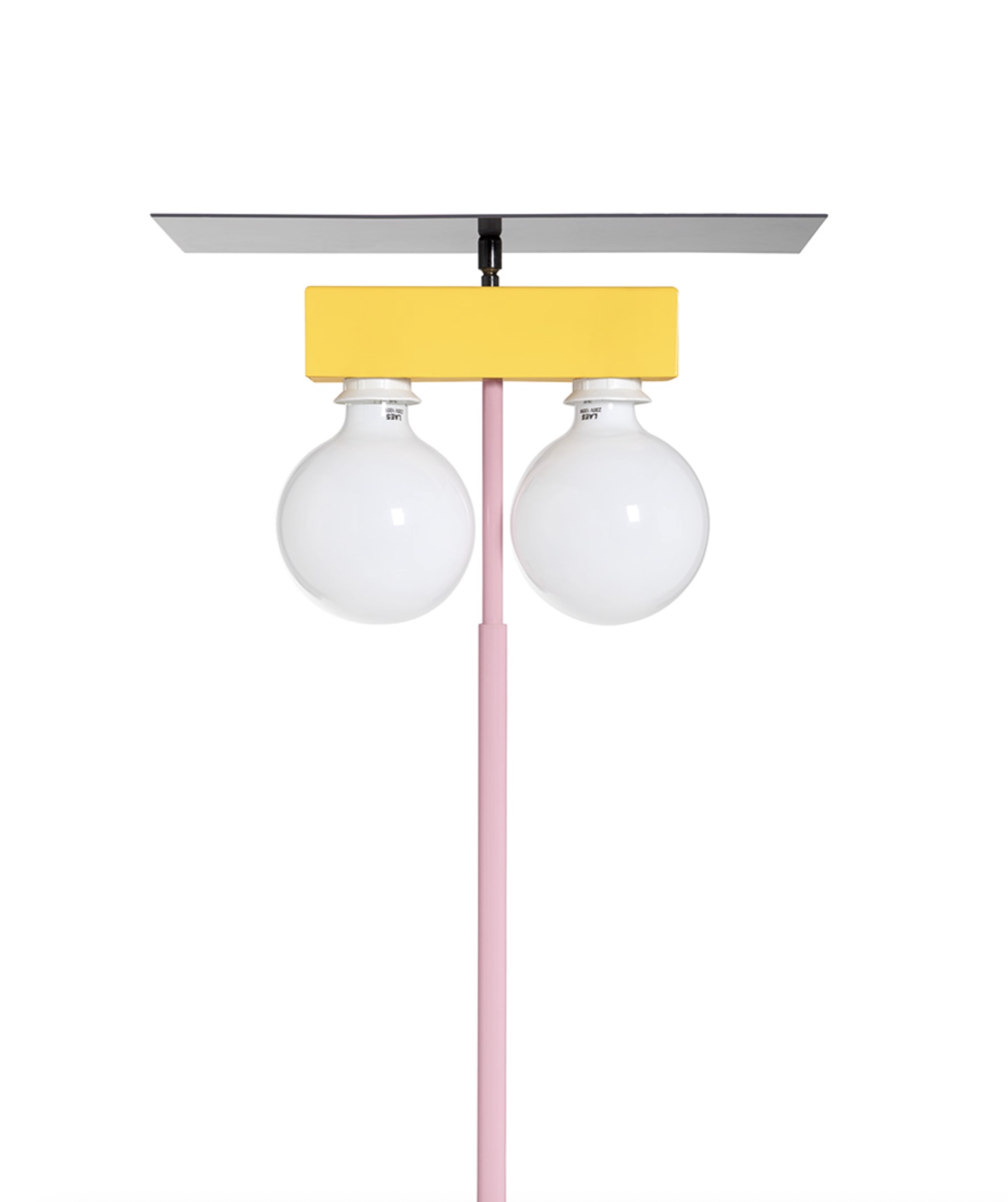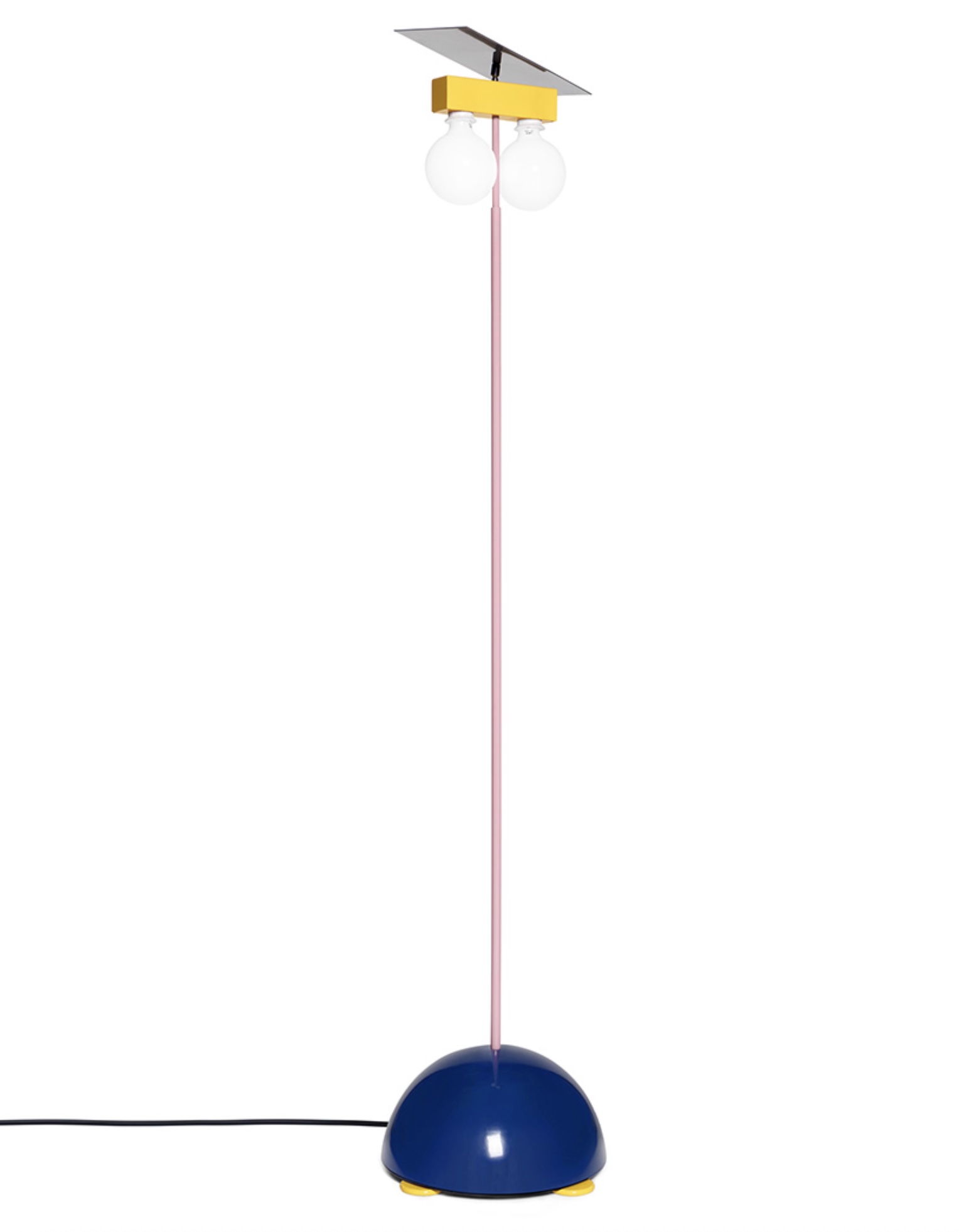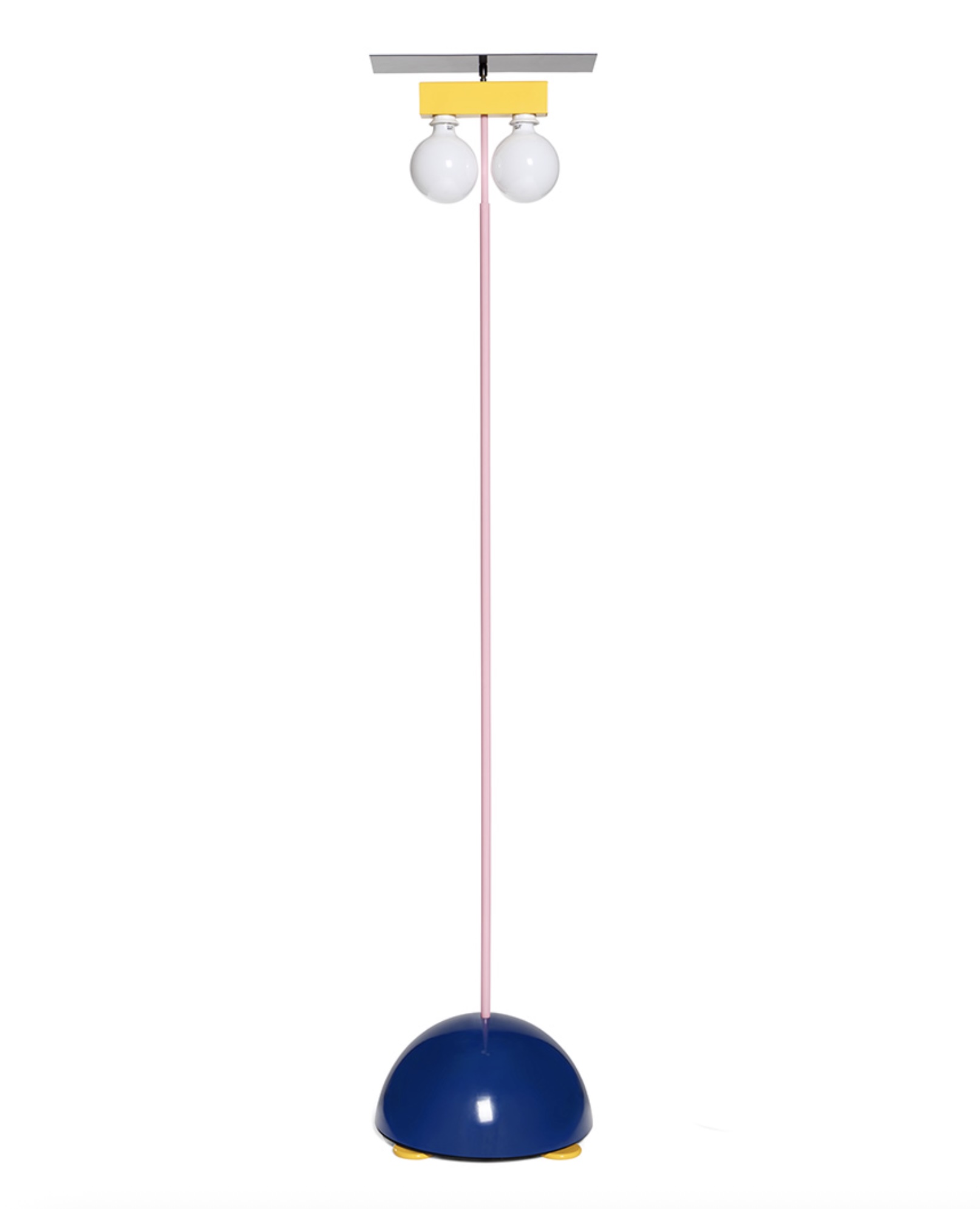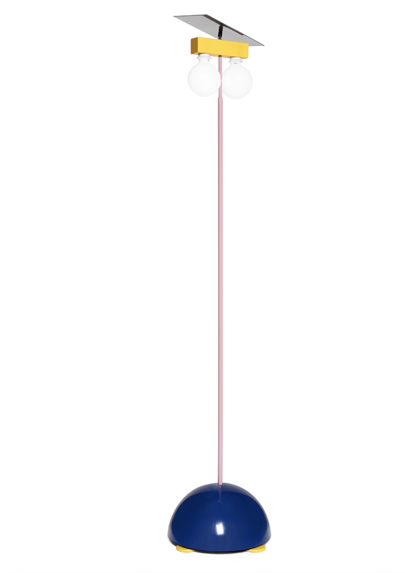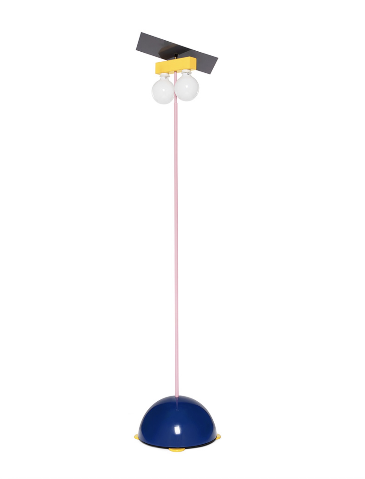 Splendid by Martine Bedin amazes with its blue and yellow-gold enameled colors and materials. Precious, sacred, and eternal colors, inscribed in a deep-rooted cultural tradition that Memphis continually eludes and embraces. This floor lamp consists of a hemispherical base that supports a slender steel rod topped with two light bulbs. It is precisely the base that is striking and intriguing, giving the lamp an anthropomorphic shape.