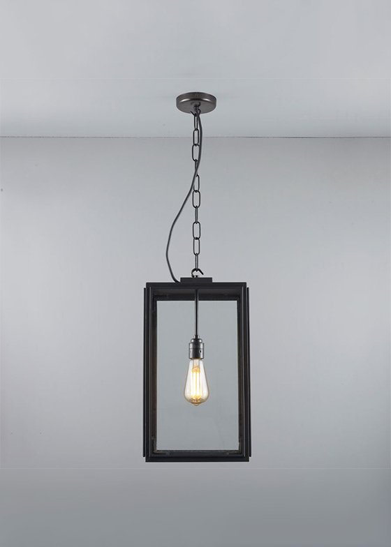 Exterior Square Pendant in weathered brass, externally glazed and available in three sizes. Suspended on a weathered brass hook 1.5 meters of chain. Glass on four sides, with a closed top for exterior use.