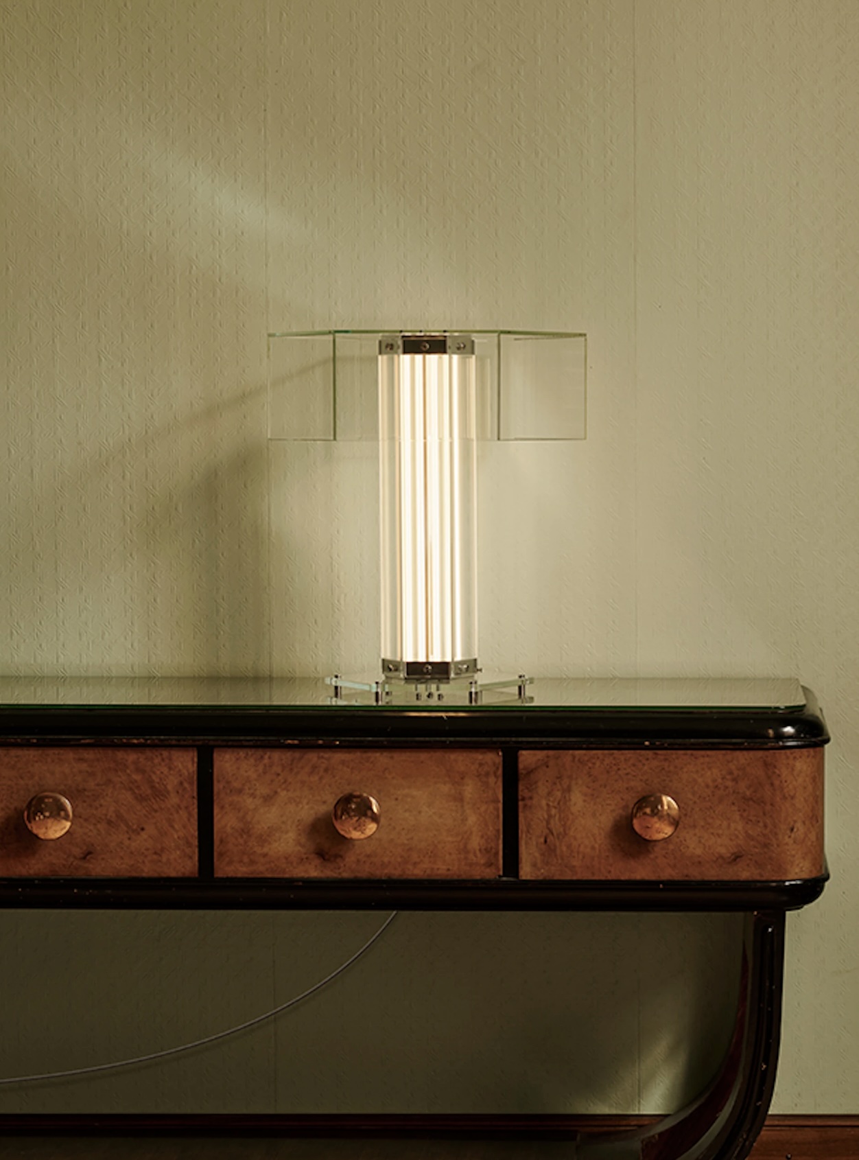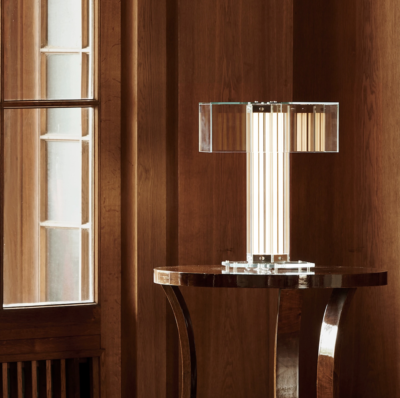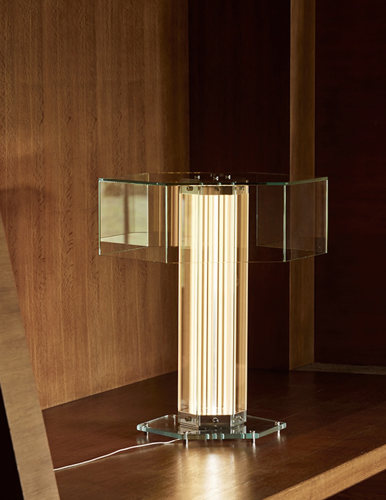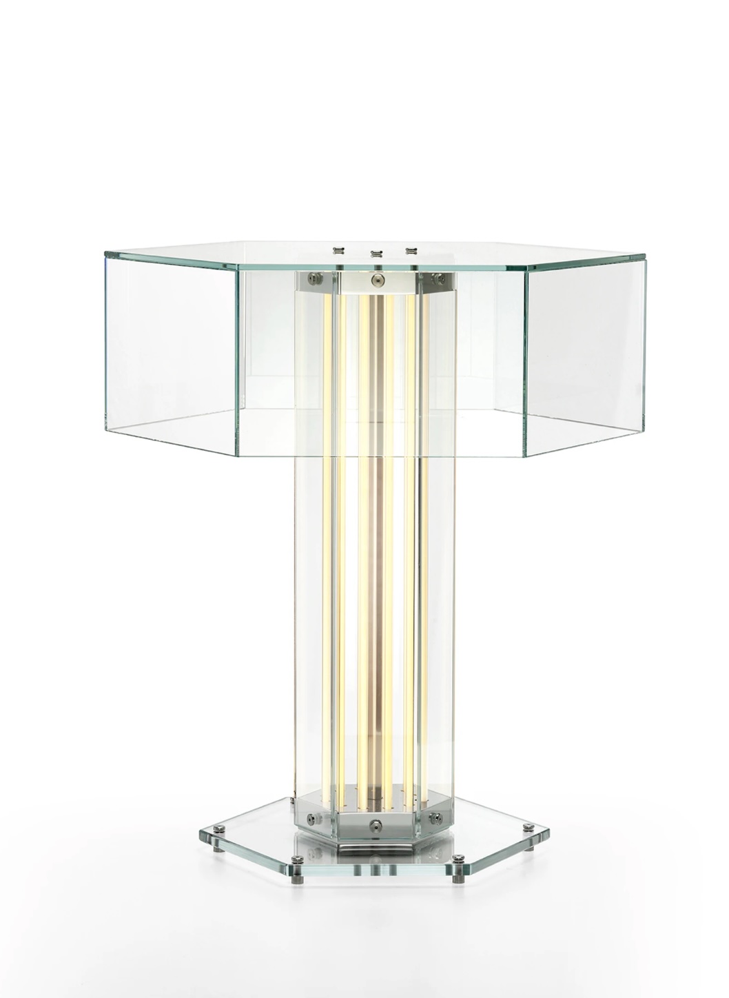 The collection includes table, suspension, and floor models. Each lamp features a hexagonal base constructed from planar glass panels connected by polished aluminium elements and illuminated by a thin, flat, and flexible LED strip, custom-developed by Flos to measure up to one metre in length.
