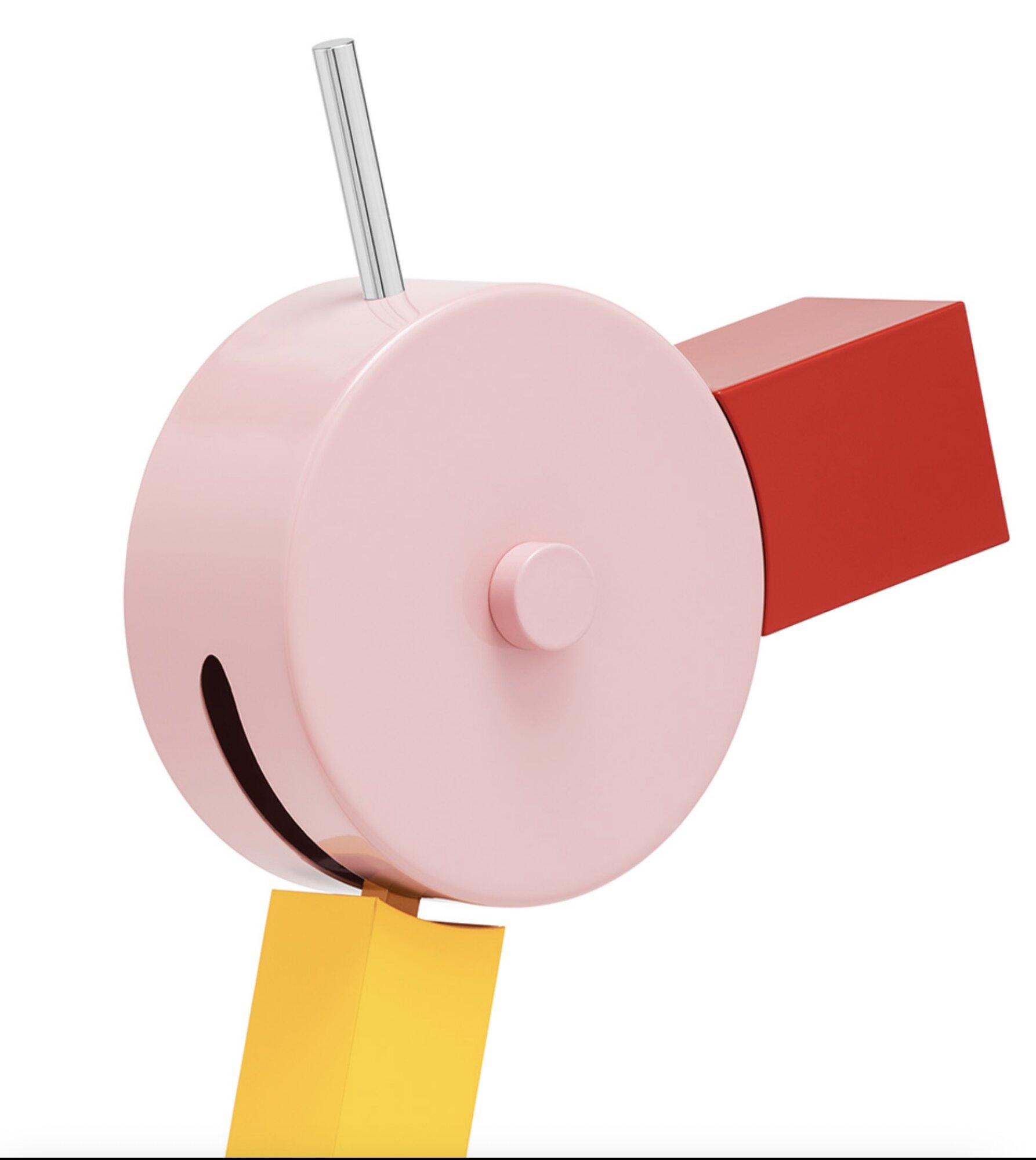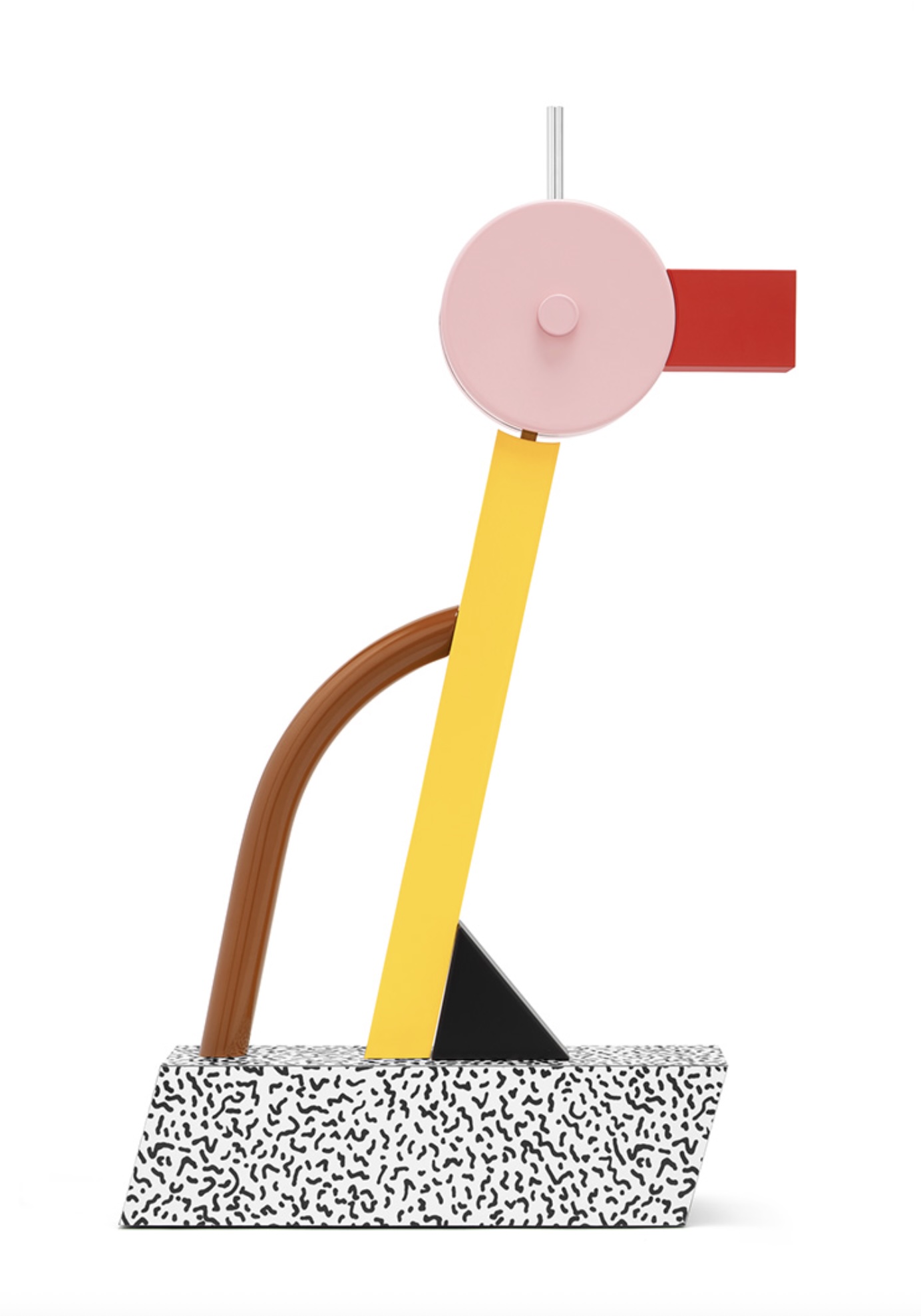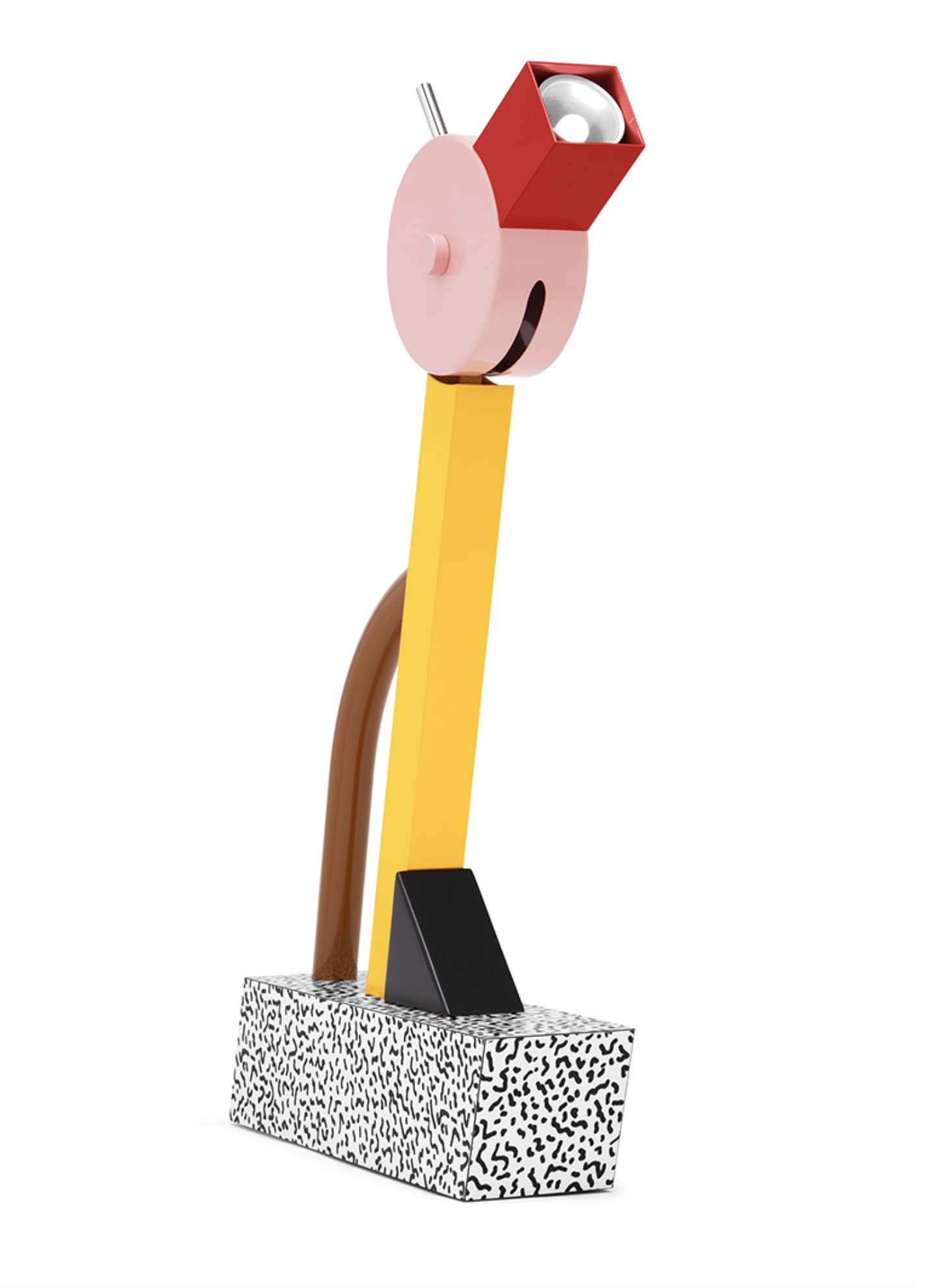Tahiti, a masterpiece by Ettore Sottsass, is an ironic lamp with a zoomorphic shape reminiscent of childhood games: the head conceals a lamp, ideal for illuminating a table. The base, featuring the Bacterio pattern, supports a yellow stem, highlighted by a black foot supporting the round pink "head," which rotates to direct the light from its red beak in the desired direction.