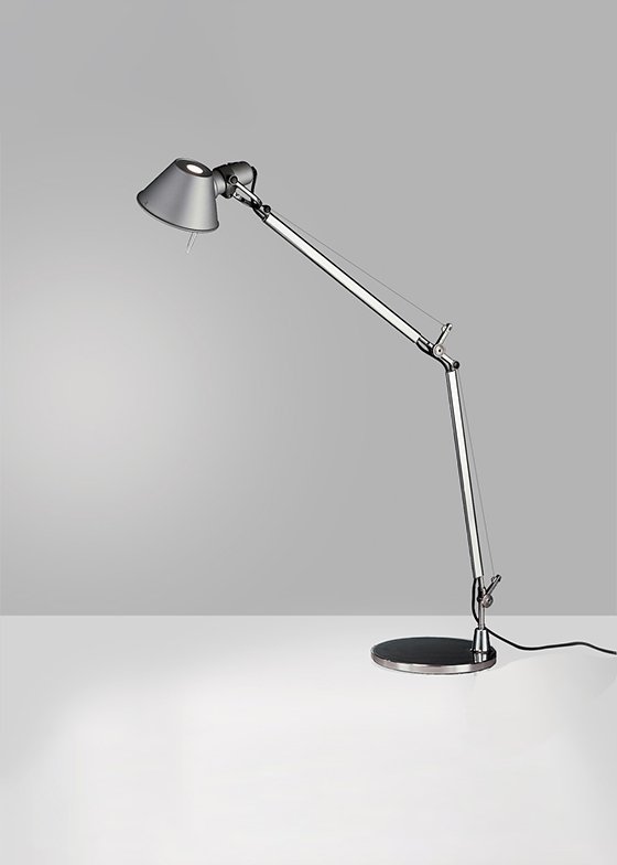 Tolomeo Classic LED by Artemide. A study in balance and movement, the Tolomeo table lamp is designed for a fully adjustable direction of light. Created for Artemide in 1987 by Michele De Lucchi and Giancarlo Fassina, Tolomeo has become an icon almost 30 years after its birth. Now available with integrated LED light source, model variations include an incorporated dimmer switch on the head, a motion sensor which uses passive infrared technology for energy conservation, and/or Tunable White LED technology allowing for varied intensities and color temperatures to be obtained.