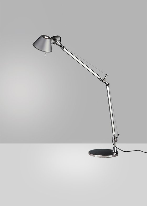 Tolomeo Classic Table Lamp by Artemide. A study in balance and movement, the Tolomeo table lamp is designed for a fully adjustable direction of light. Created for Artemide in 1987 by Michele De Lucchi and Giancarlo Fassina, Tolomeo has become an icon almost 30 years after its birth. Now available with integrated LED light source, model variations include an incorporated dimmer switch on the head, a motion sensor which uses passive infrared technology for energy conservation, and/or Tunable White LED technology allowing for varied intensities and color temperatures to be obtained. “No desk lamp should make you use two hands to position it.” Michele De Lucchi.