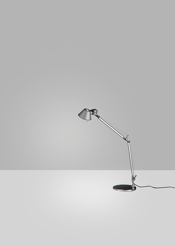 Tolomeo Mini Table Lamp by Artemide. A study in balance and movement, the Tolomeo table lamp is designed for a fully adjustable direction of light. Created for Artemide in 1987 by Michele De Lucchi and Giancarlo Fassina, Tolomeo has become an icon almost 30 years after its birth. Now available with integrated LED light source, model variations include an incorporated dimmer switch on the head, a motion sensor which uses passive infrared technology for energy conservation, and/or Tunable White LED technology allowing for varied intensities and color temperatures to be obtained.