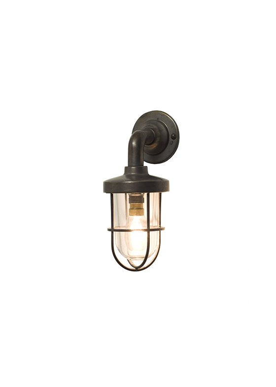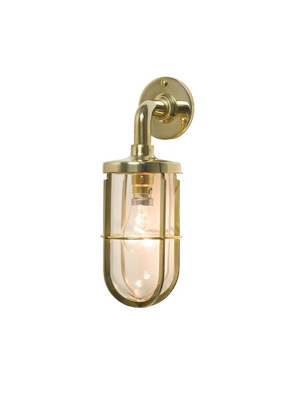 Original BTC Weatherproof Ship’s Well Wall Light features a solid brass structure with a caged glass diffuser. Given a weathered patina, the historical design stirs images of seafaring vessels from the 20th century, as if salvaged from an old shipyard. The metal structure is skillfully crafted into an oblong shape, shielding the clear glass and light source as it sits slightly away from the wall.