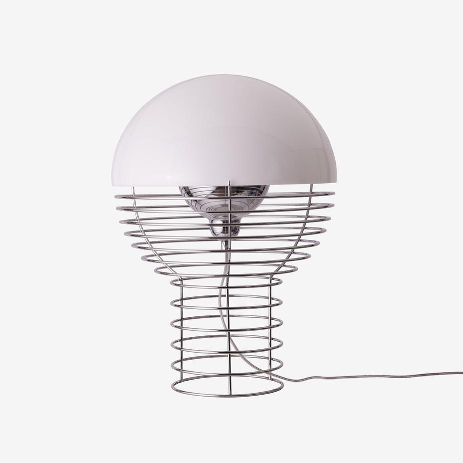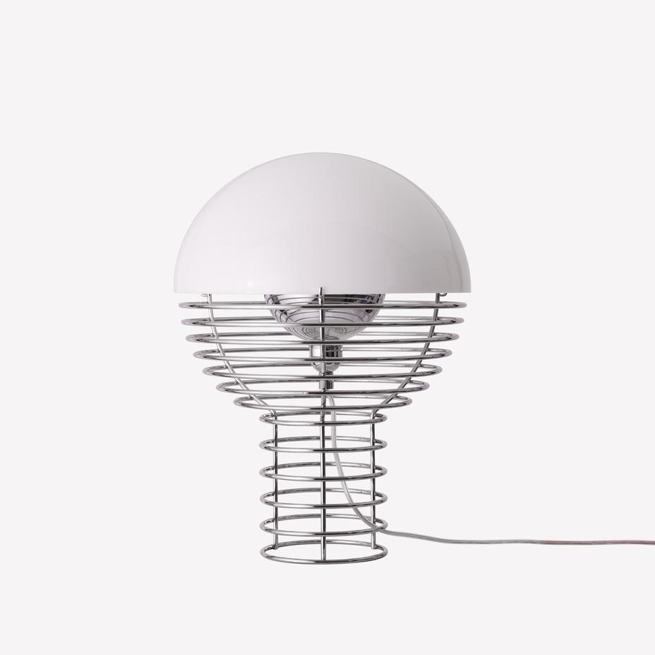 The decorative Wire Table Lamp is defined by its chrome-plated steel wire framework, which widens at the top to support a hemispherical plastic shade. The open wire structure gives the design a distinctive yet light and non-intrusive appearance, making it both sculptural and functional.